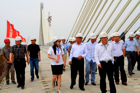 6月13日上午,柬埔寨王國公共工程與運輸部國務(wù)秘書林西德奈在交通投資集團總工程師關(guān)健、工程技術(shù)部長王輝,集團公司董事長劉前進及中原高速新登分公司領(lǐng)導(dǎo)陪同下對商登高速鄭州境段跨南水北調(diào)大橋施工和路面工程施工進行現(xiàn)場觀摩。