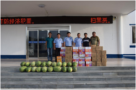 連日來的天氣高溫不減,酷暑難耐。8月5日下午,在緊張的路面施工空閑時間,周南高速平宛段九標(biāo)項目經(jīng)理部帶著西瓜、礦泉水、冰茶等防暑降溫用品,前往南陽市宛城區(qū)紅泥灣鎮(zhèn)公安分局,為一線民警送去清涼,感謝酷暑中認(rèn)真執(zhí)勤的公安民警,也感謝公安民警為周南高速施工創(chuàng)造了平安穩(wěn)定的環(huán)境。炎炎夏日送清涼,絲絲情意暖人心。此次慰問送清涼活動讓民警們深切感受到了施工企業(yè)的真誠和愛心,民警深受激勵和鼓舞,表示感謝的同時,表示絕不辜負(fù)企業(yè)和社會的關(guān)心厚愛,不畏酷暑,忠實履職,繼續(xù)以十足的干勁、百倍的熱情全力投入到各項工作中去,為周南高速順利通車保駕護(hù)航。(一公司)